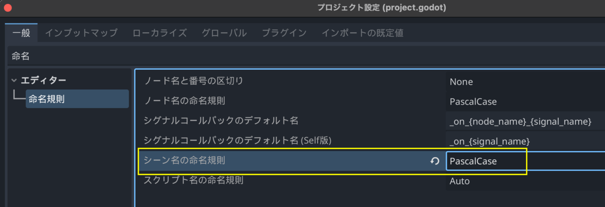 細かい部分ですが、Godotはデフォルトだとシーンをsnake case (小文字) で保存するので「シーンの命名規則」を "PascalCase" にしておくと大文字始まりで保存するようになって便利です。